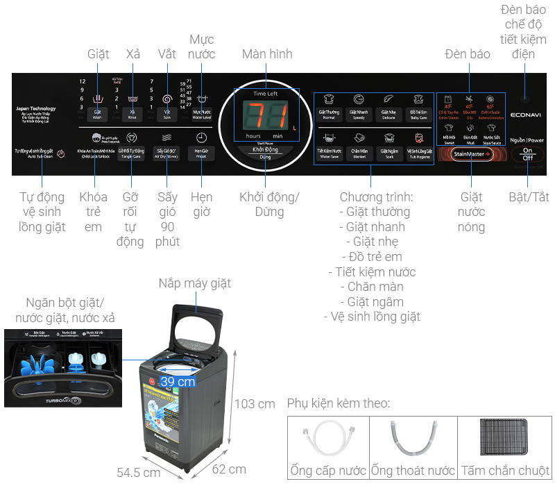 Khối lượng giặt 9.5 kg, phù hợp gia đình từ 5 - 7 người