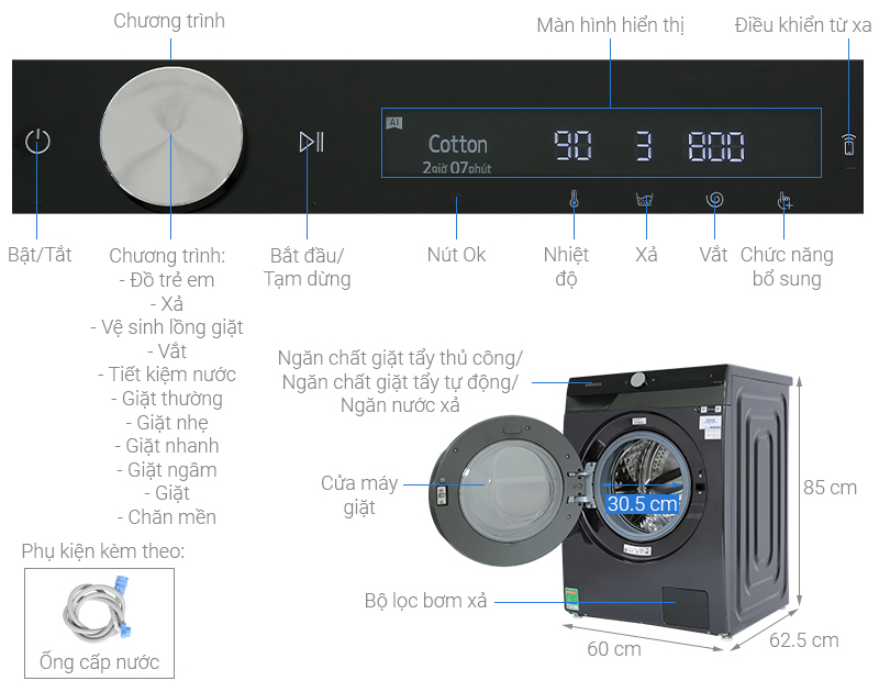 Chiếc máy giặt Samsung này được trang bị bảng điều khiển thông minh AI có khả năng ghi nhớ thói quen sử dụng, từ đó đề xuất cho bạn chế độ giặt và cài đặt yêu thích. Hơn nữa, màn hình hiển thị thông minh các quy trình giặt, giúp người dùng dễ hiểu và thao tác nhanh chóng hơn khi sử dụng.