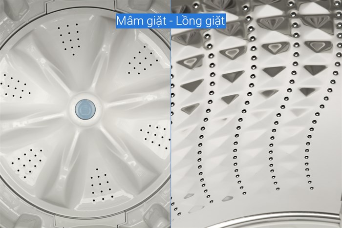 - Lồng giặt bằng thép không rỉ hạn chế rỉ sét, thiết kế các lỗ thoát nước nhỏ giảm khả năng làm tưa sờn mặt vải, bảo vệ quần áo, đảm bảo hiệu quả giặt giũ tối ưu.