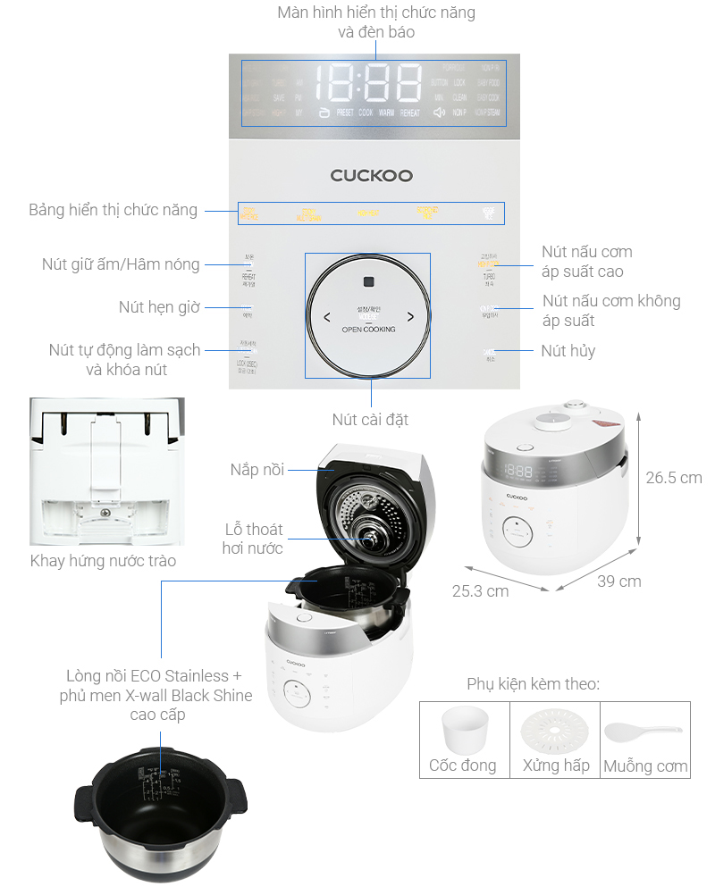 Nồi có chức năng thông báo bằng giọng nói 3 ngôn ngữ tiếng Anh, tiếng Hàn Quốc, tiếng Trung Quốc