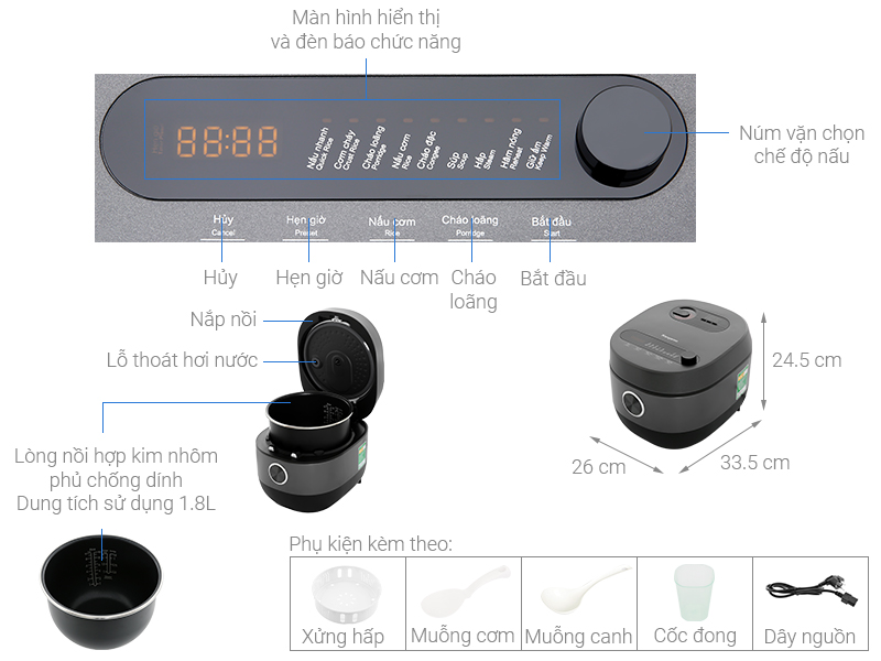 Bao gồm: nấu cơm, nấu nhanh, cơm cháy, cháo loãng, cháo đặc, súp, hấp, hâm nóng, giữ ấm.