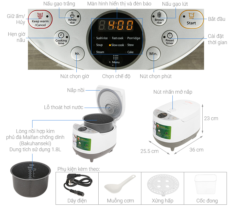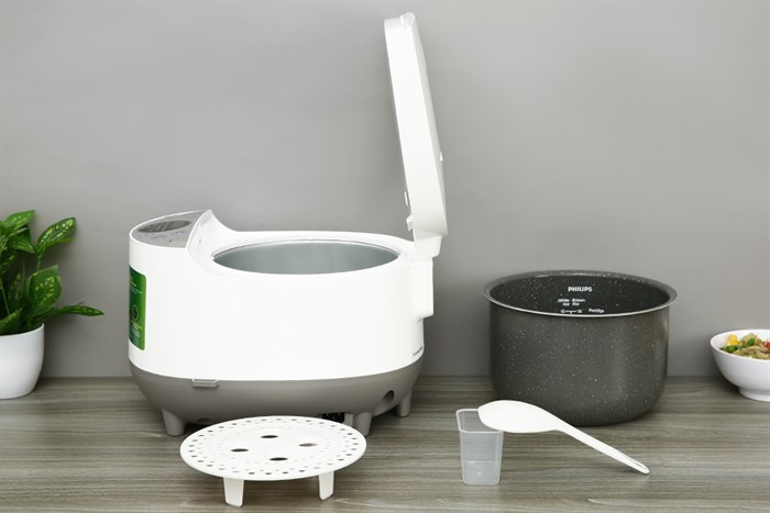 - Phụ kiện kèm theo bao gồm: cốc đong, muỗng cơm, xửng hấp.