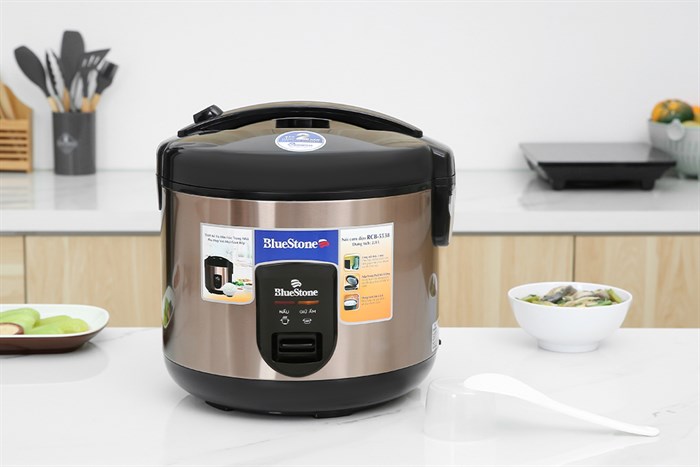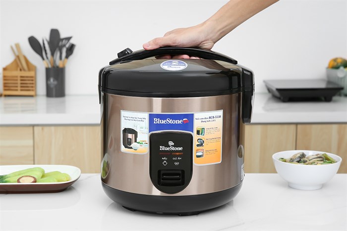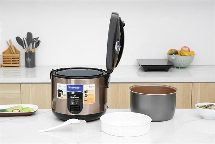 - Mẫu nồi cơm điện BlueStone này được thiết kế màu đen kết hợp vàng đồng hiện đại, góp phần làm tăng thêm tính thẩm mỹ cho không gian bếp.