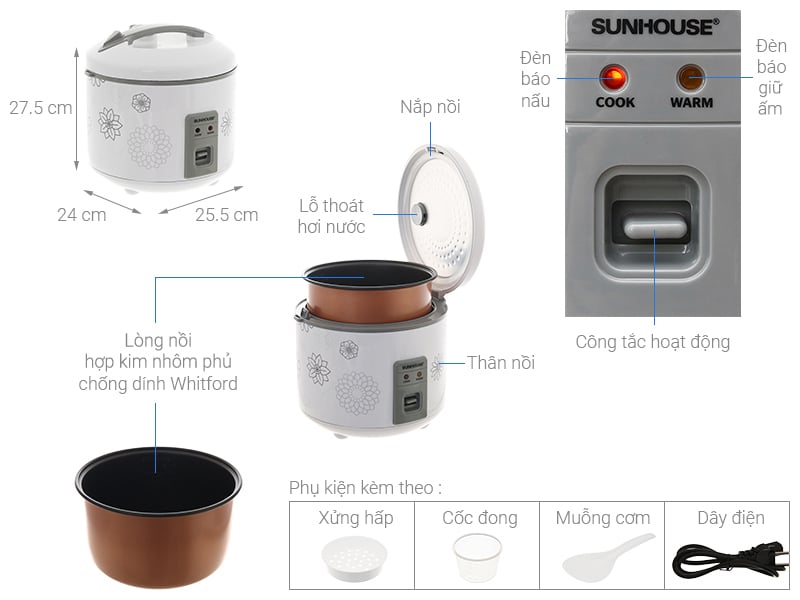 Nồi cơm nắp gài Sunhouse 1.8 lít SHD8603 của thương hiệu Sunhouse uy tín Việt Nam, sản xuất tại Việt Nam, thiết kế đẹp, sử dụng đơn giản, thương hiệu Sunhouse quen thuộc với mọi gia đình.