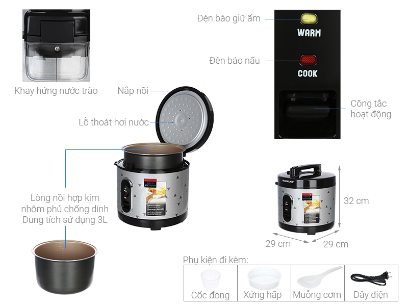 - Phụ kiện đi kèm: xửng hấp, muỗng cơm và cốc đong.