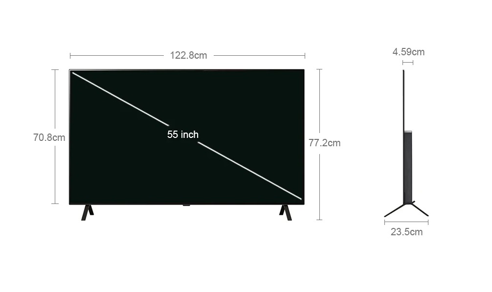 • Kích thước không chân, treo tường: Ngang 122.8 cm - Cao 70.8 cm - Dày 4.59 cm