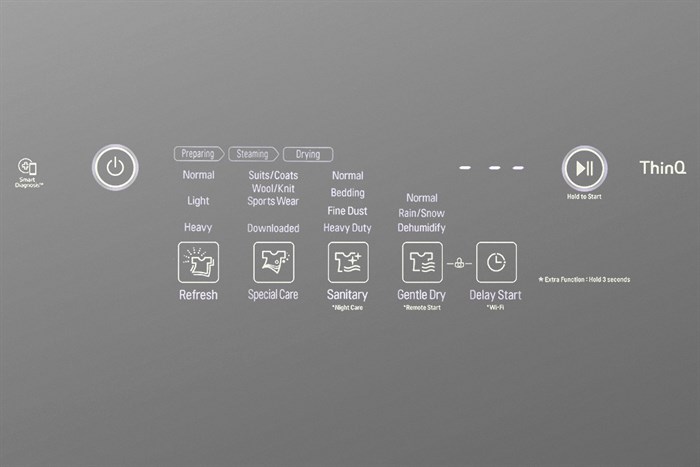 - Tủ chăm sóc quần áo LG có 5 chương trình chăm sóc quần áo được tích hợp sẵn: Chăm sóc đặc biệt, giặt mưa, tuyết, khử trùng Sanitary, làm mới quần áo, sấy khô, tùy theo nhu cầu bạn lựa chọn chương trình phù hợp.