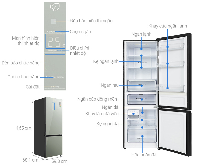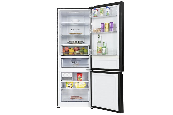 - Ngăn lạnh có dung tích 167 lít chia làm 3 ngăn đi kèm 1 ngăn rau củ, 1 ngăn đông mềm đa năng Magic Room cùng 3 khay chứa nằm ở bên cánh cửa tủ.