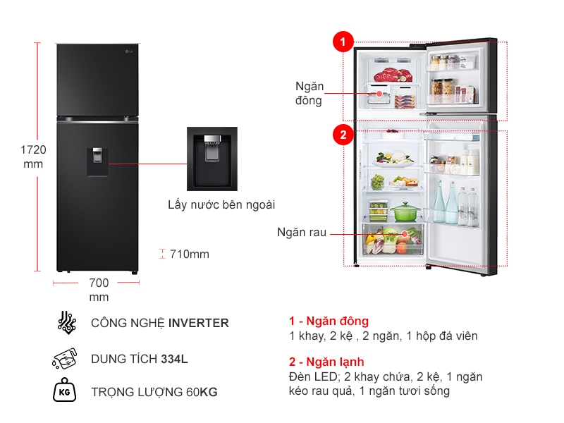 - Tủ lạnh có dung tích sử dụng 334 lít, phù hợp với các gia đình có từ 3 - 4 người.